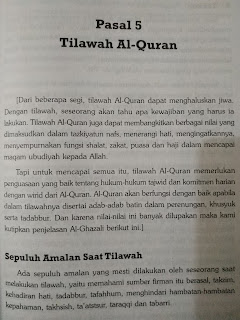 Nah yang menarik di buku tazkiyatun nafs ini, ada banyak 'amalan hati' yang harus diupayakan ketika tilawah Alquran. Bukan hanya sekedar dipahami isinya, tapi juga butuh kehadiran hati dan pikiran, agar Alquran terasa dekat, agar kita benar-benar merasa Allah yang sedang berbincang langsung sama kita.